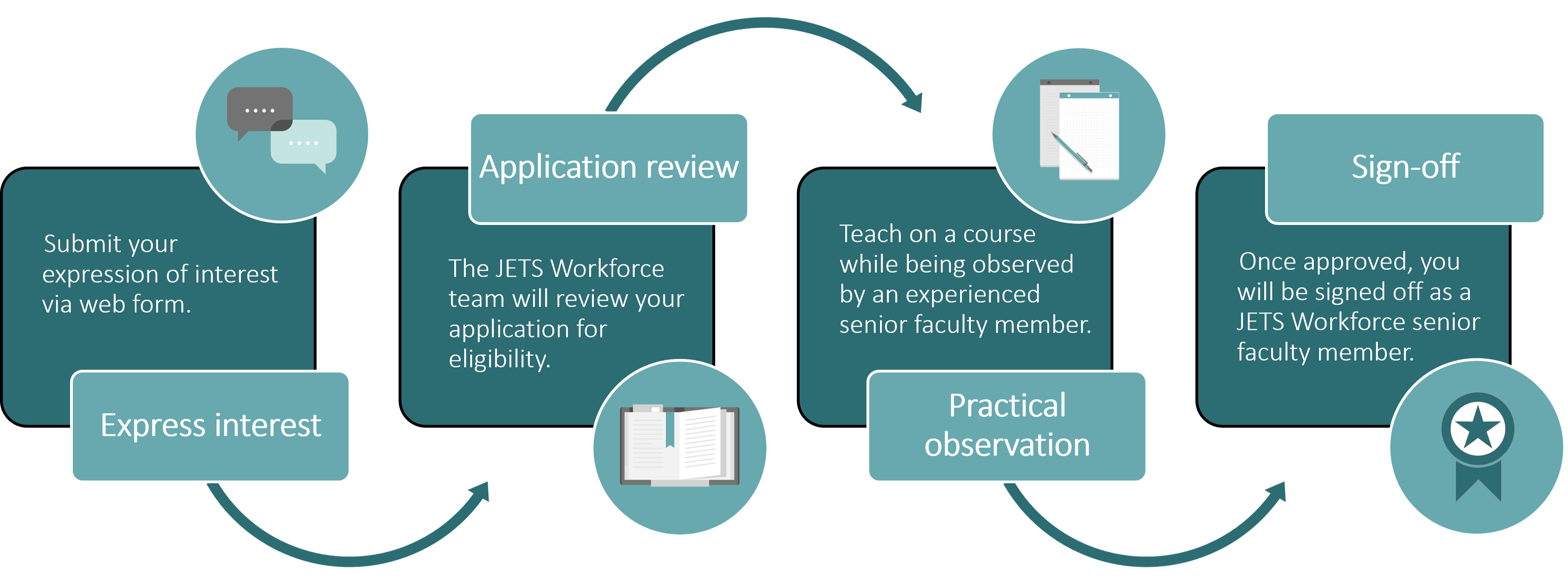 To ensure the highest standards of instructional quality and mentorship, the JETS Workforce programme requires a formal sign-off process. The pathway to becoming a senior faculty member is outlined below: